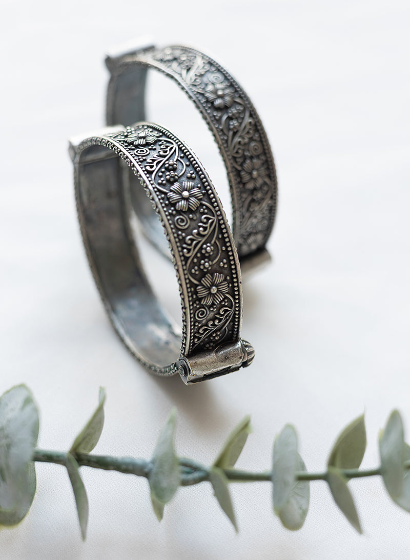 Occasion: Oxidised jewelry refers to pieces that have undergone a chemical process to darken the metal, typically silver, to give it an aged or antique appearance. Oxidised jewelry requires special care to maintain its appearance. it's recommended to store oxidised jewelry in a dry place away from direct sunlight and to avoid exposing it to harsh chemicals or abrasive materials when cleaning.Despite their vintage appearance, oxidised bracelets can be remarkably versatile. Styling oxidised bangles can add a unique, vintage, and sometimes bohemian touch to your outfit. Oxidised bangles look stunning with traditional Indian outfits like sarees, lehengas, and salwar kameez. Choose bangles with intricate designs to complement embroidered or embellished clothing.