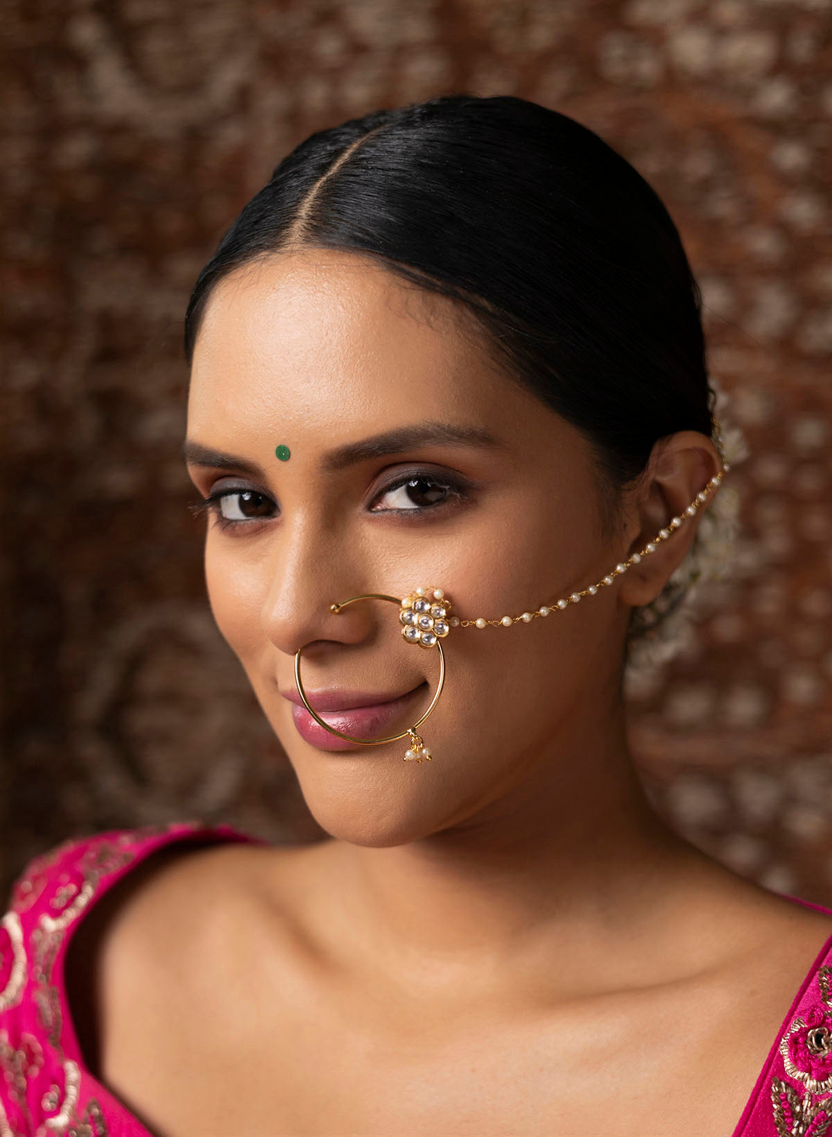 Occasion: For all the bride-to-be's, we bring you these beautiful handcrafted kundan naths in gold plating with white kundan and bead sahara. Go for that ethereal look by wearing them on your wedding day.