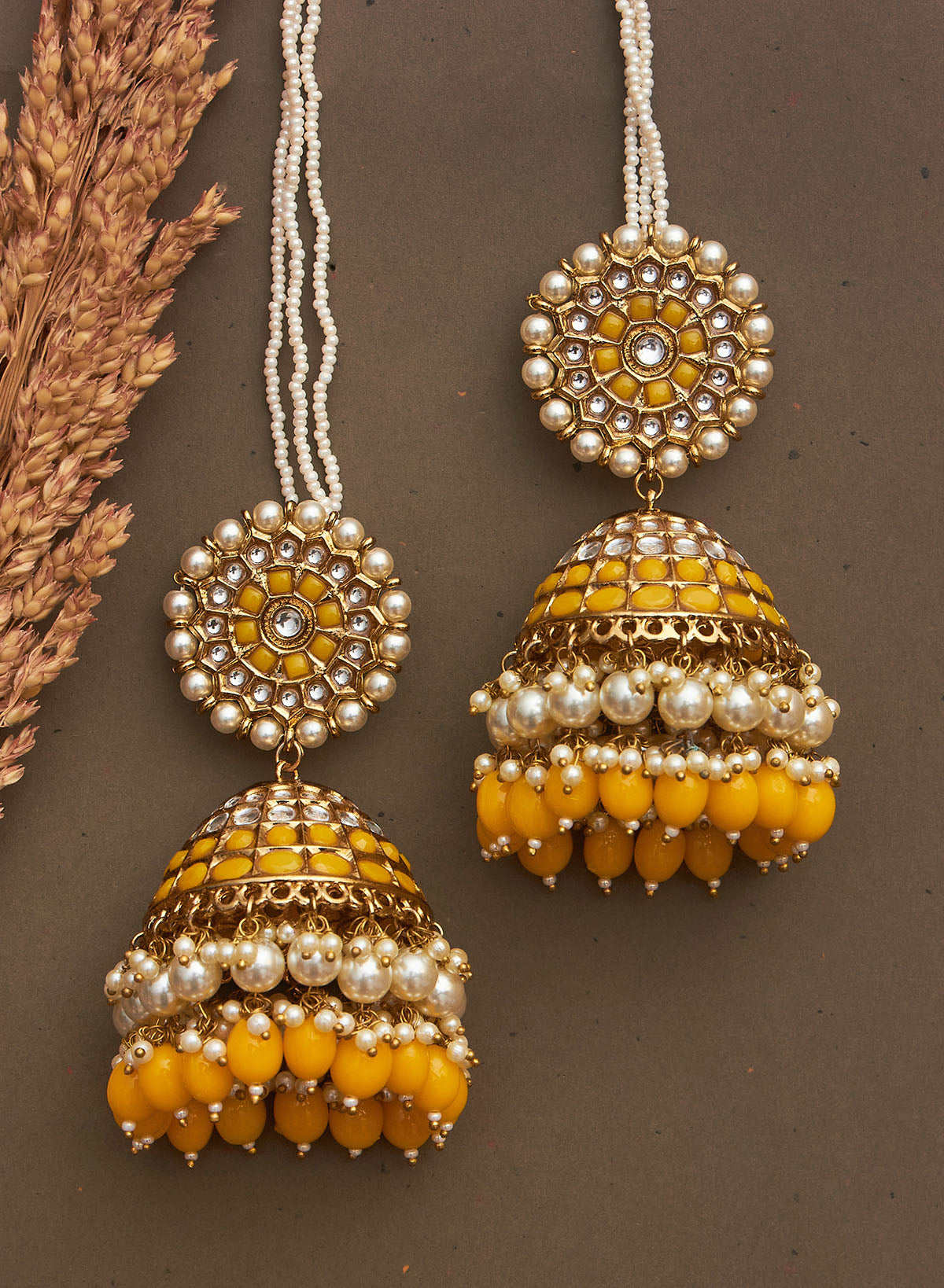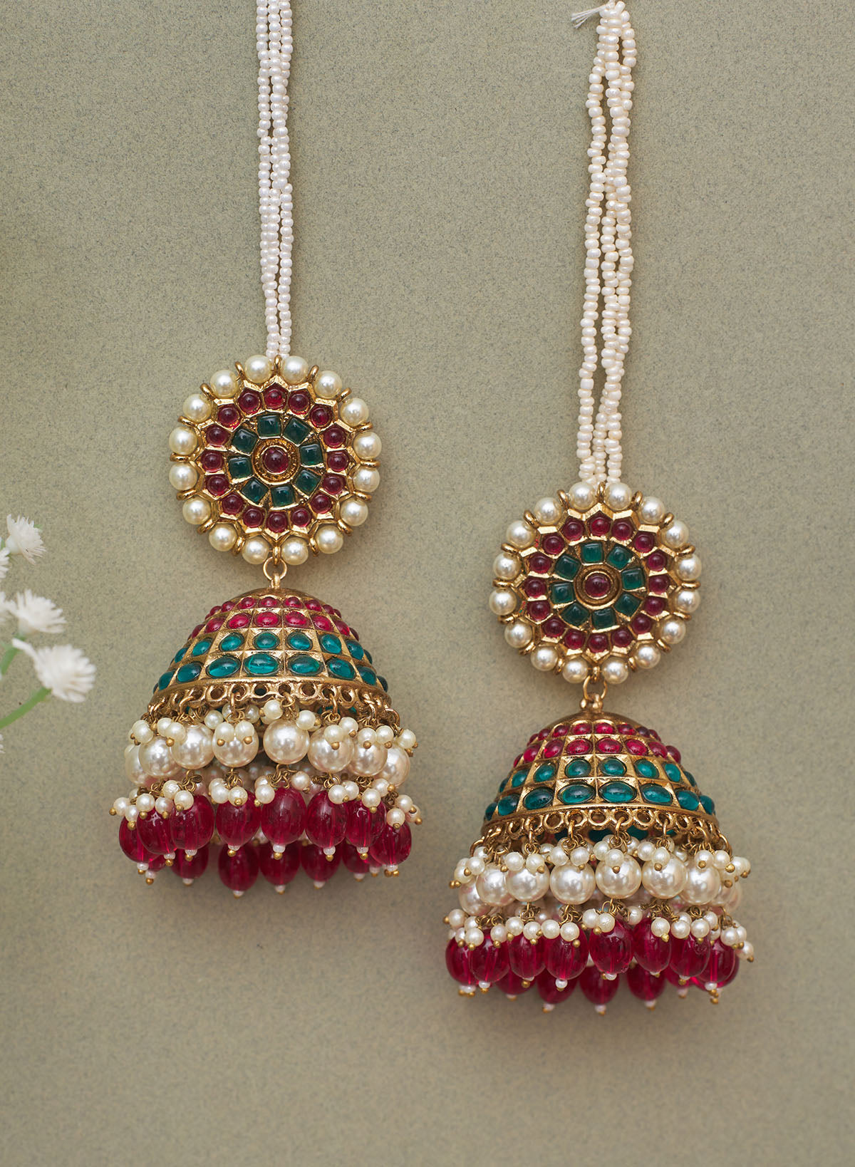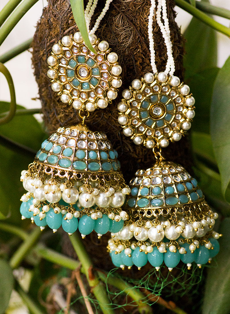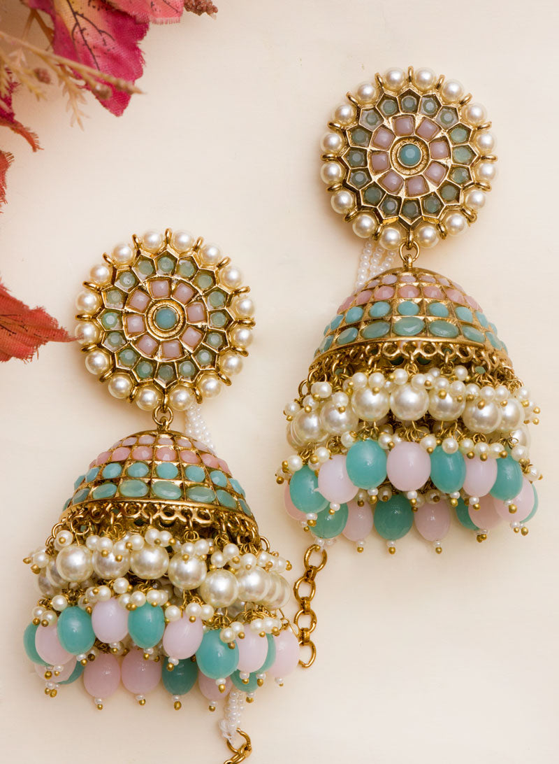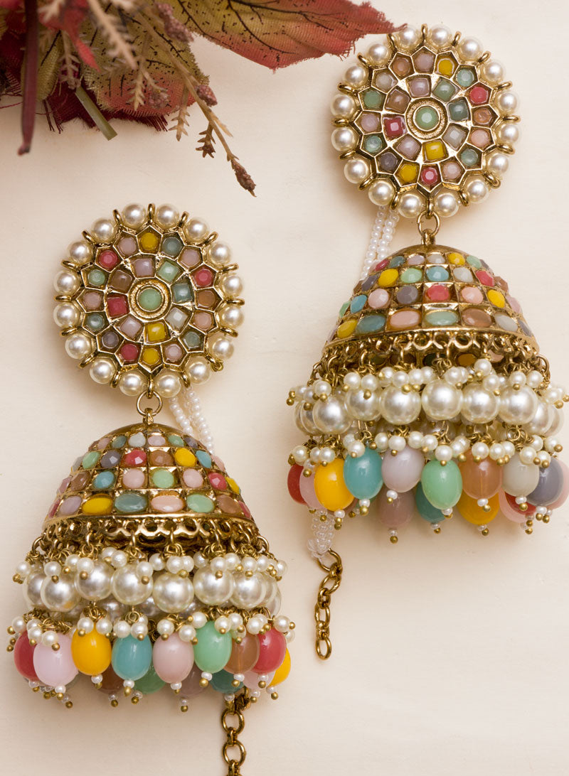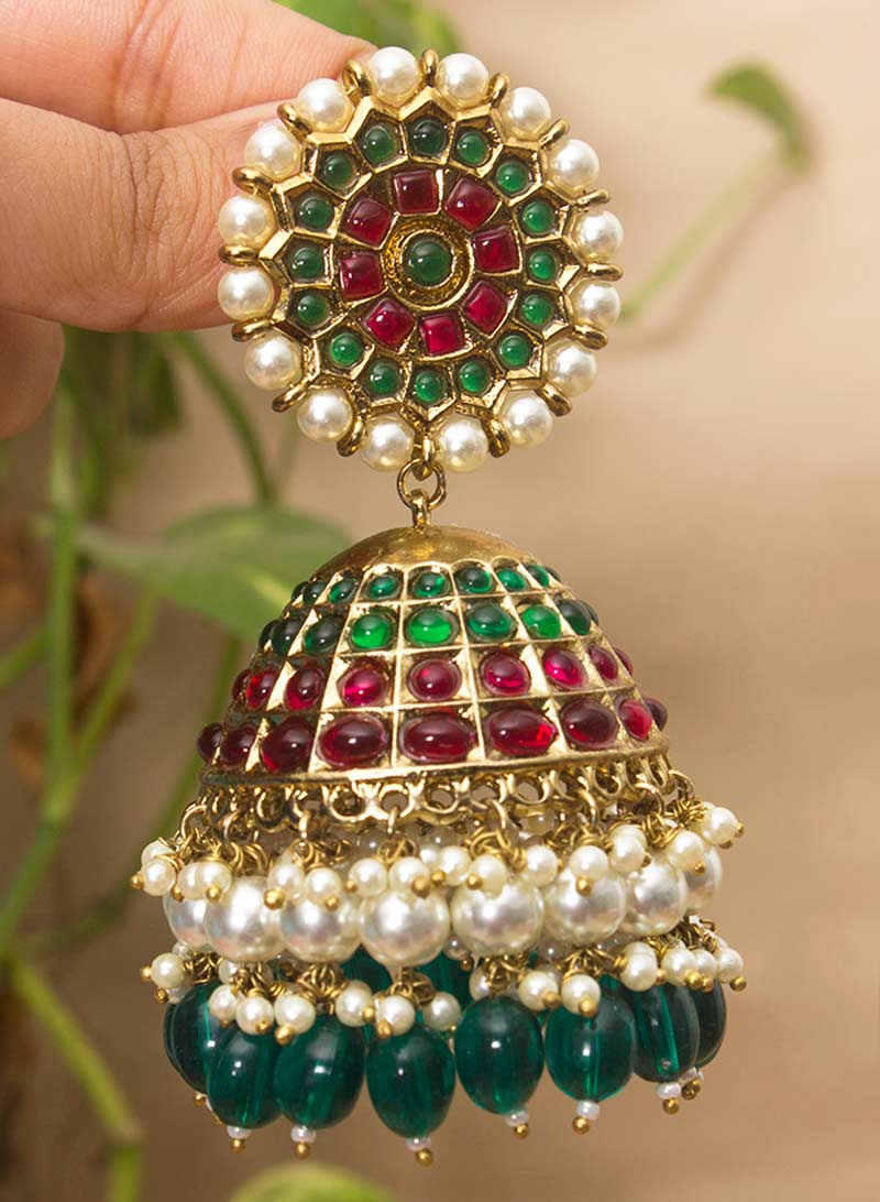 Enhance your look by giving it a fashionable twist with our oversize stone jhumka with hanging beads Wear it with your saree, suit,