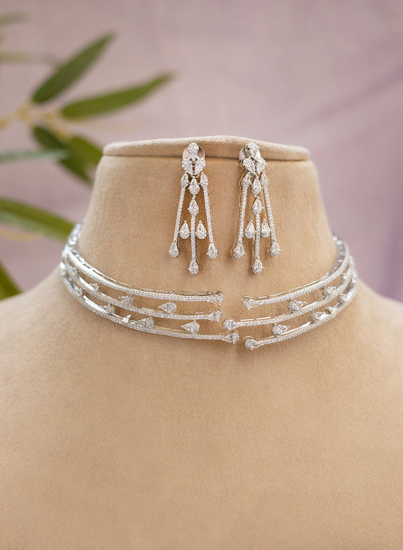 The sleek Hasli necklace paired with matching statement earrings creates a royal yet modern look, making it an ideal choice for weddings, parties, and festive celebrations. Its exquisite detailing and luxurious finish ensure that you stand out with unmatched charm.