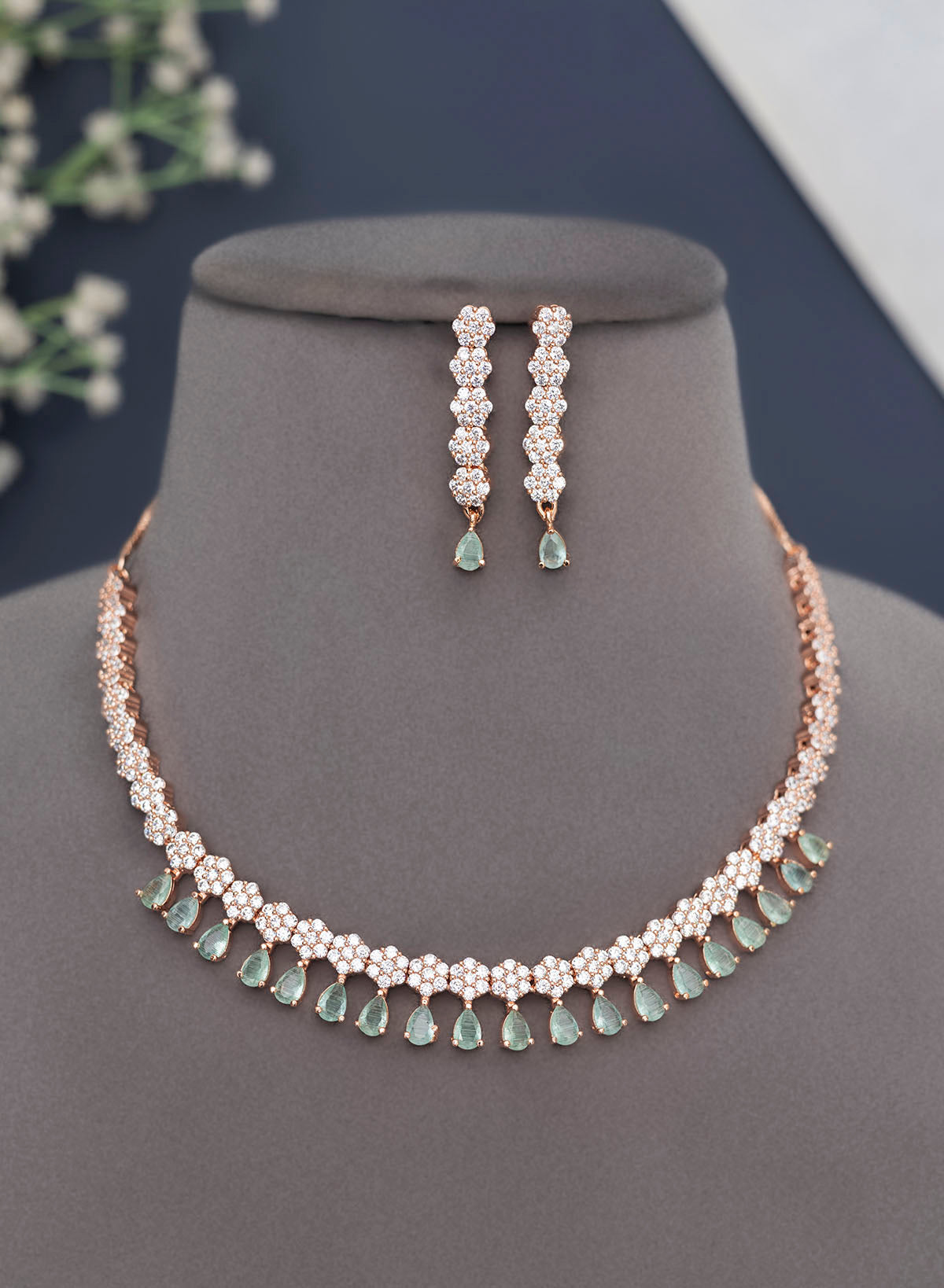 Occasion: An American diamond necklace set is a popular jewelry choice that mimics the appearance of real diamonds but is made from high-quality cubic zirconia or similar stones. These sets often feature intricate designs and can be quite elegant, making them a favored option for formal events or everyday wear.Styling an American diamond set can be a fun way to enhance your overall look for various occasions.These necklace set will elevate your look on this wedding occasion, sangeet , marriage ,engagement, puja.