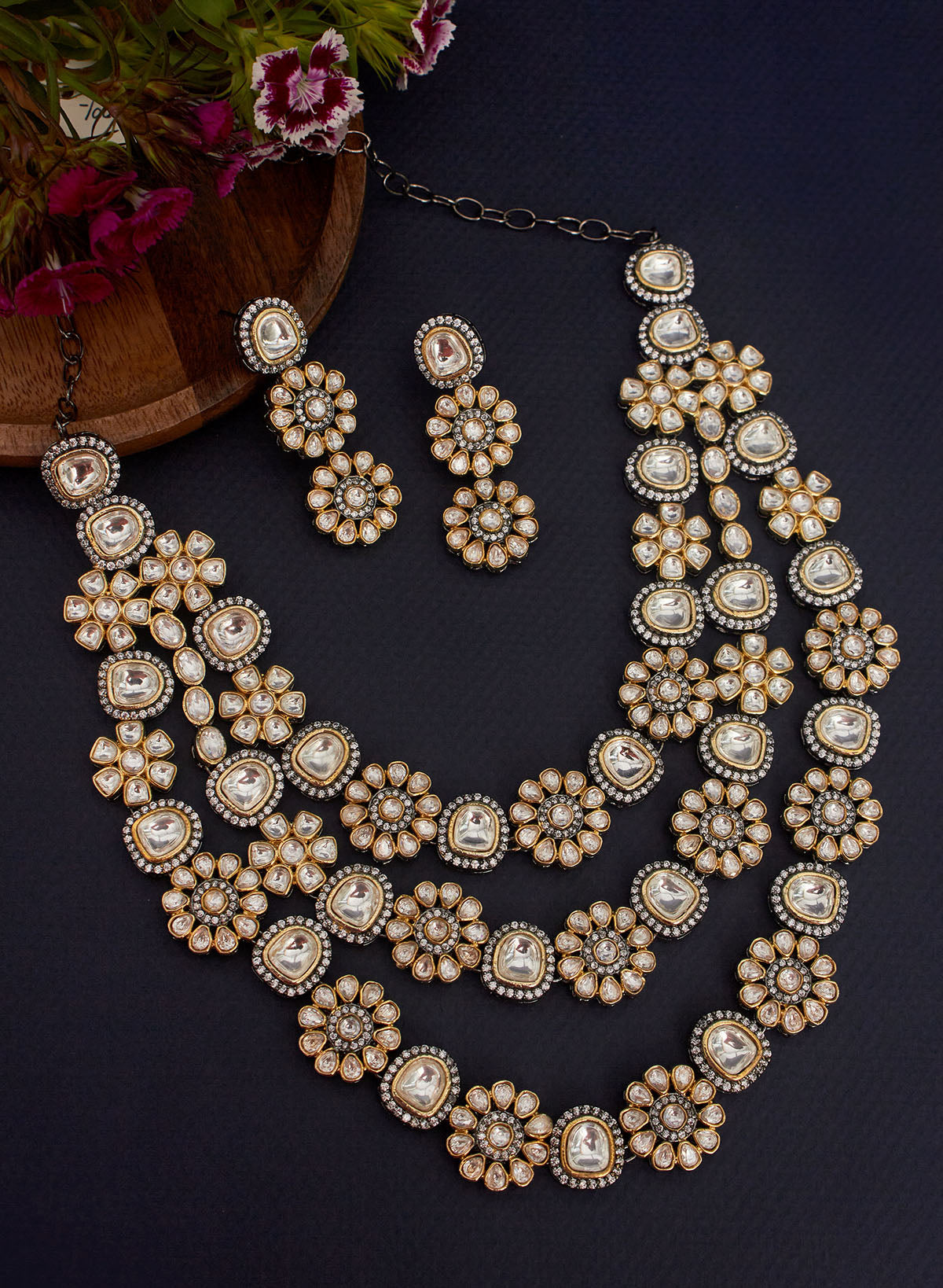You can also wear this kundan polki three layer necklace with black silk saree with golden border for a reception.