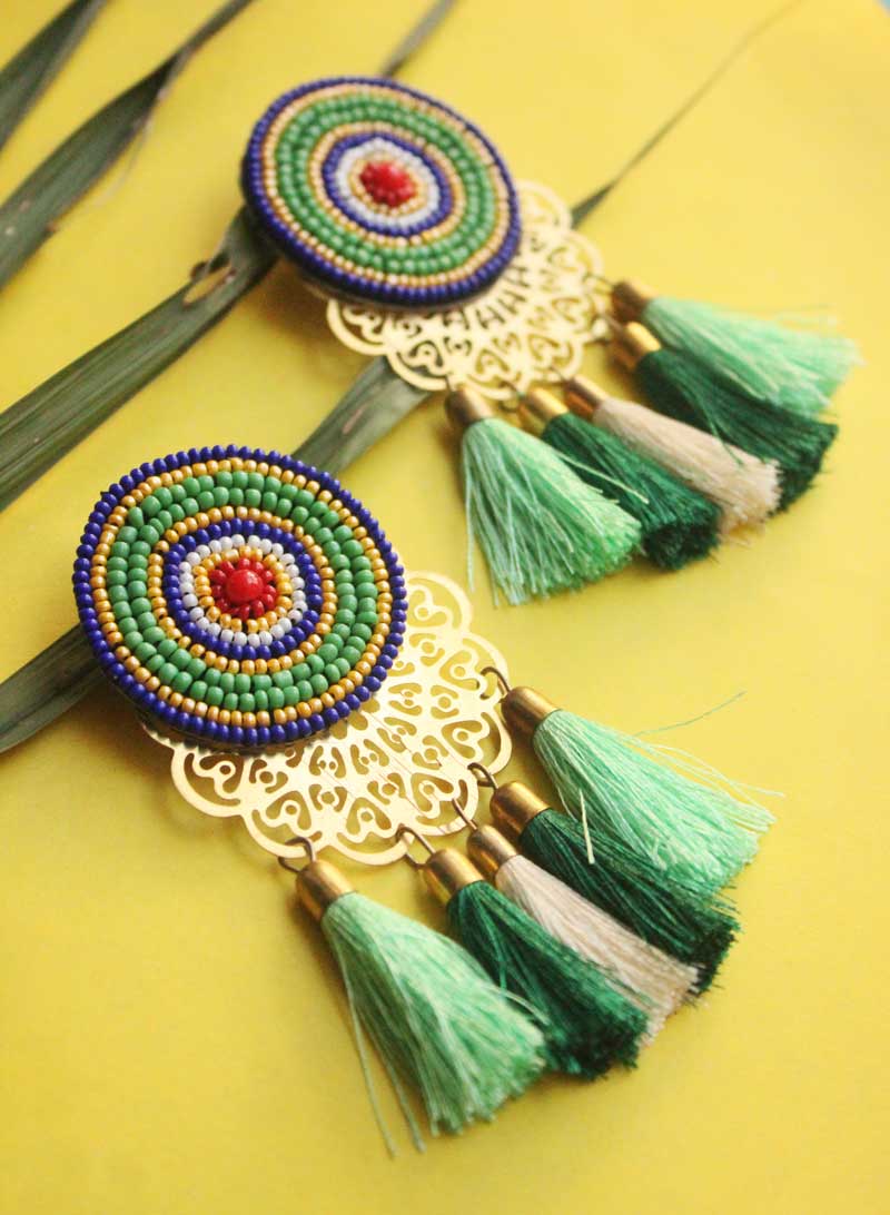 Blue and Green Beaded Tassel Earring