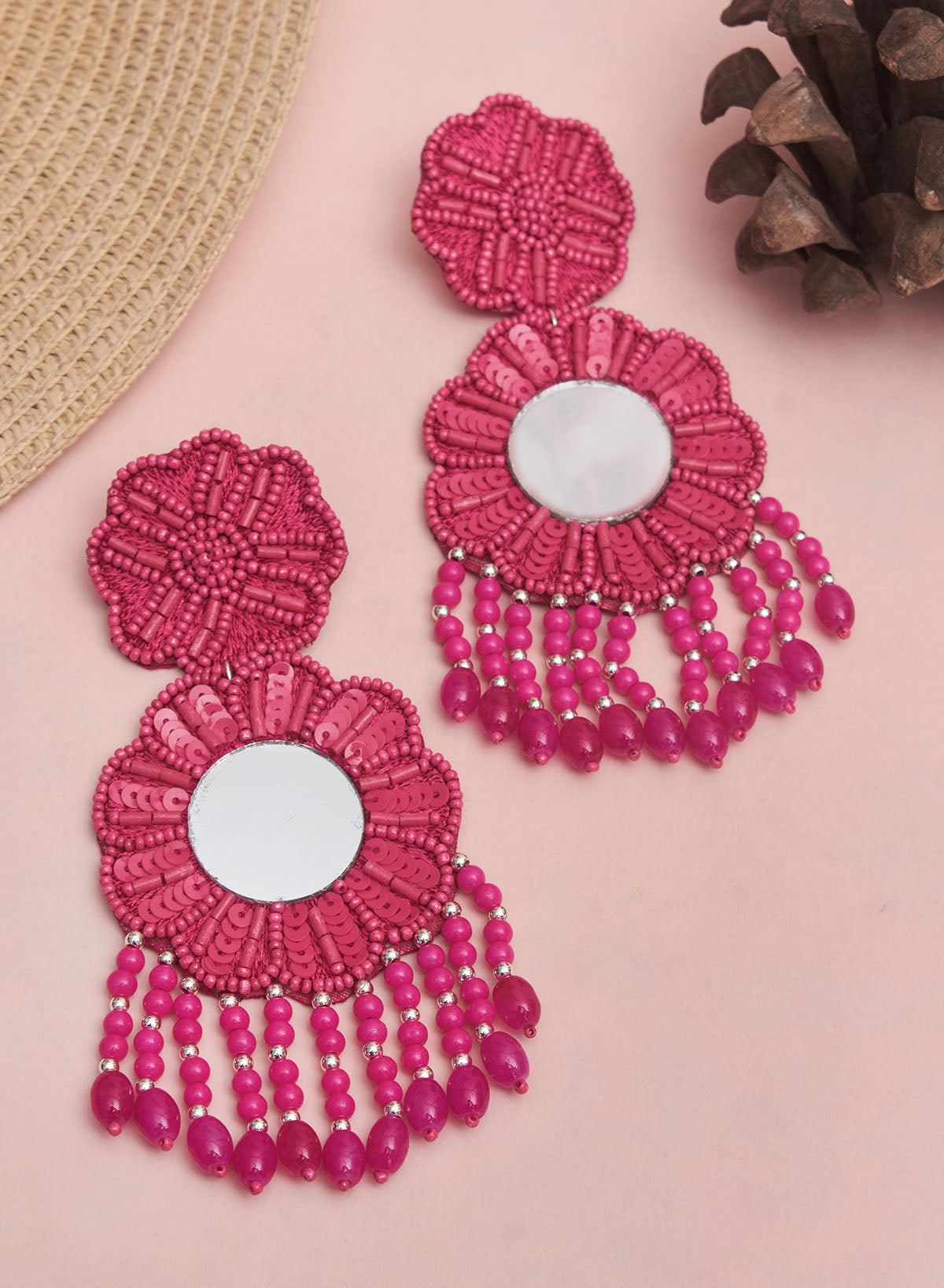 You can wear it with a black or white dress, with pink mirror long earrings to go for a contrast look for summer break. These earrings can also be matched with a denim and bright yellow crop top with a shrug for a boho beach party.