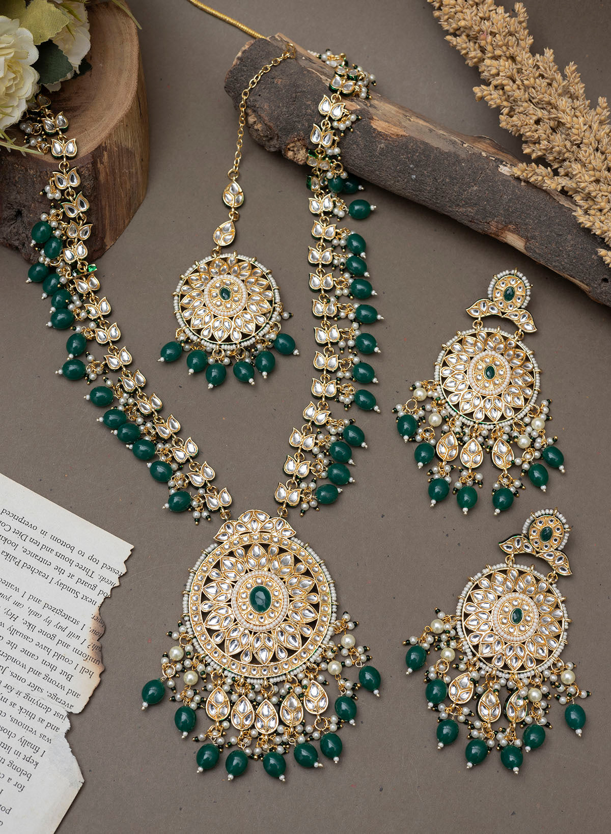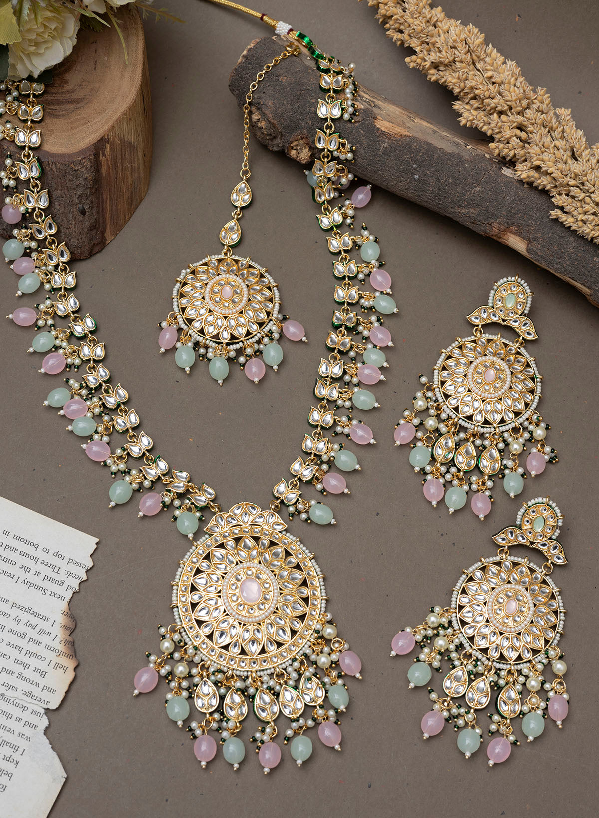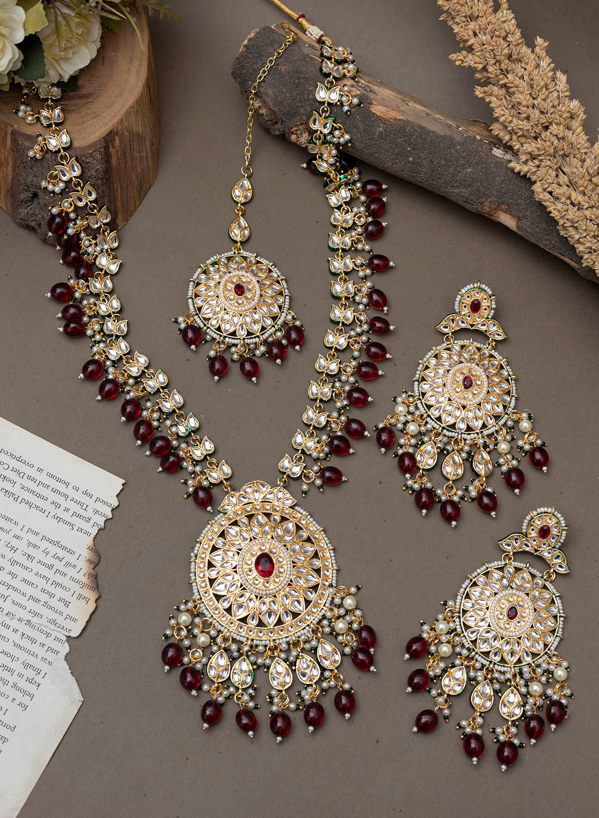 Occasion: Selecting the perfect wedding necklace set involves considering the neckline of your dress, your personal style, and how the pieces will complement your overall look .Add some beauty to your jewellery collection with these gold plated necklace set with maangtika .These necklace set will elevate your look on this wedding occasion, sangeet , marriage ,engagement, puja.