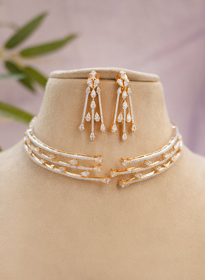 The sleek Hasli necklace paired with matching statement earrings creates a royal yet modern look, making it an ideal choice for weddings, parties, and festive celebrations. Its exquisite detailing and luxurious finish ensure that you stand out with unmatched charm.