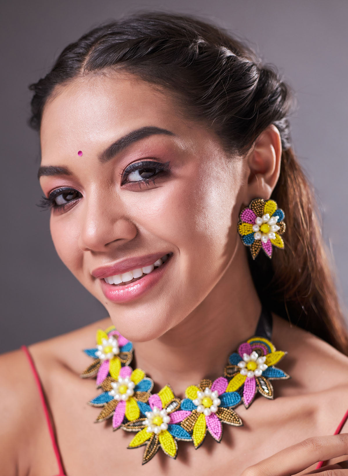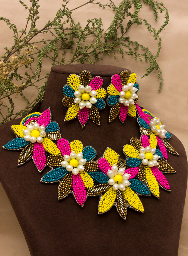 Occasion: This beautifully handmade necklace set in mixed materials like beads , resham thread and mirrors which you can enjoy wearing on your special day on your haldi , mehendi or any high end parties ,wedding or on any festive occasion also can be styled out with indo -western outfit, ethnic outfits ,also can be teamed up with your western styles