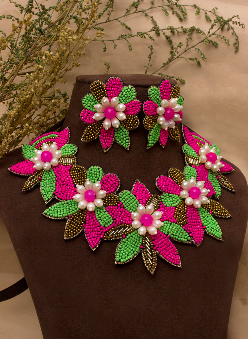 Occasion: This beautifully handmade necklace set in mixed materials like beads , resham thread and mirrors which you can enjoy wearing on your special day on your haldi , mehendi or any high end parties ,wedding or on any festive occasion also can be styled out with indo -western outfit, ethnic outfits ,also can be teamed up with your western styles